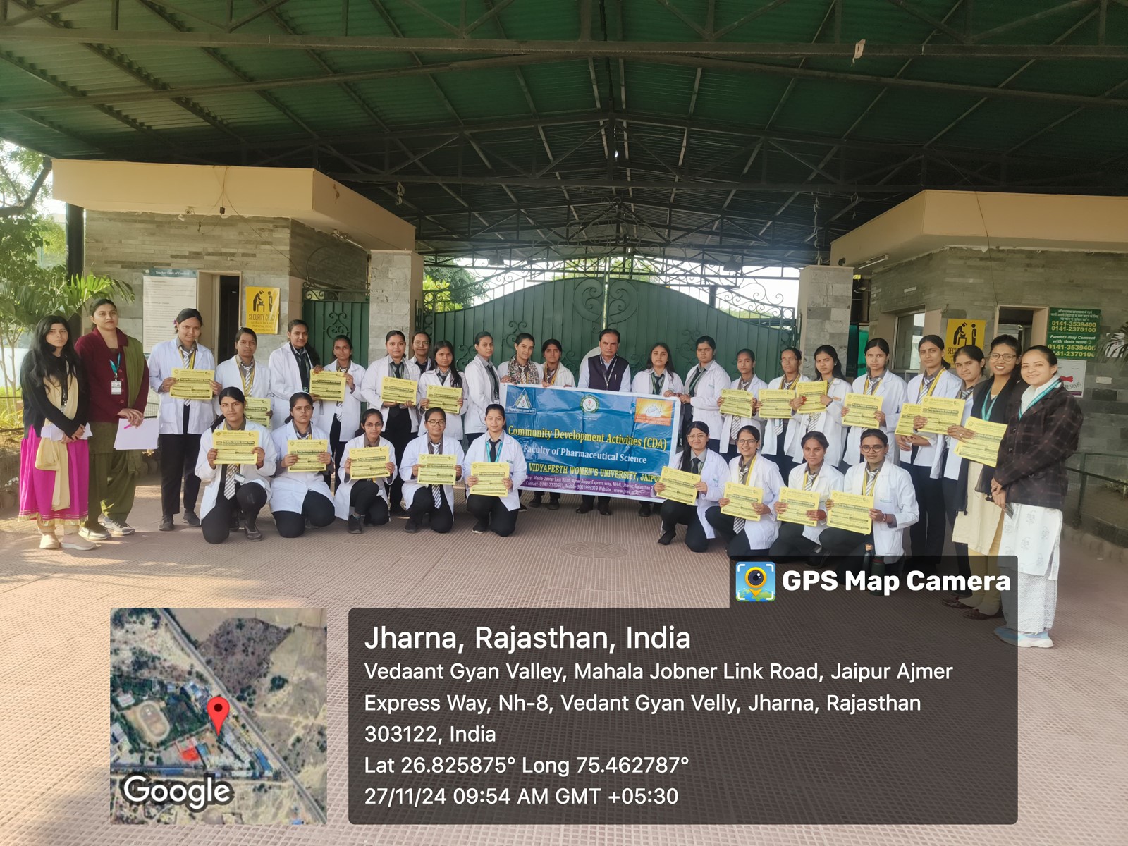 On November 27, 2024, students from the Faculty of Pharmaceutical Science organized an awareness camp in adopted villages to promote the use of generic medicines available at the Bhartiya Jan Aushadhi Kendra established on the JVWU campus.