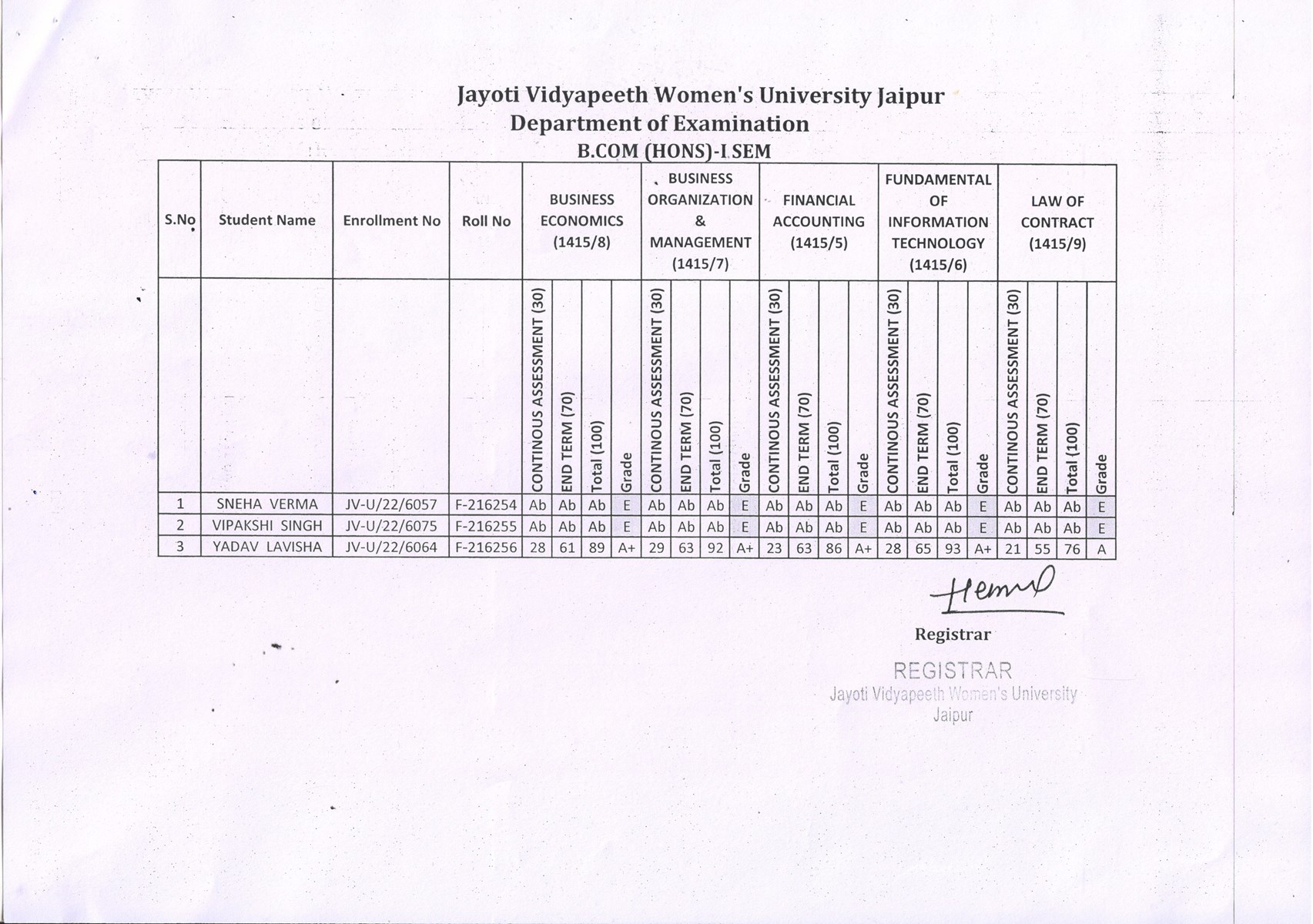 Result .B.COM(HONS) ISEM