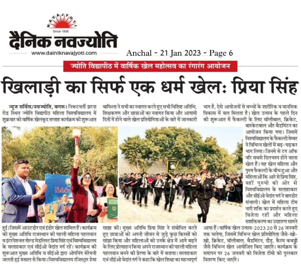 ज्योति विद्यापीठ महिला विश्विद्यालय जयपुर में आज से वार्षिक खेलकूद सप्ताह की शानदार शुरुआत की गई जिसके अंतर्गत आउटडोर और इंडोर कई तरह के खेलो का आयोजन हैं। इस कार्यकम की आगाज मुख्य अतिथि राजस्थान की पहली महिला महिला बॉडीबिल्डर और इंटरनेशनल गोल्ड मेडिअलिस्ट प्रिया सिंह एवं विश्वविद्यालय के सलाहकार एवं सीईओ वेदांत गर्ग जी द्वारा मसाल जलाकर किया गया । इसके साथ ही सलाहकार एवं सीईओ वेदांत गर्ग जी द्वारा प्रिया सिंह जी को मोमेन्टो ओर् शाल देकर सम्मानित किया गया। विश्वविद्यालय की रजिस्ट्रार हेमा बाफिला जी ने सभी का स्वागत करते हुए सभी मुख्या अतिथि, विशिष्ट अतिथि, शिक्षकगण और छात्राओं का स्वागत किया और आगामी दिनों में होने वाले खेलो के बारे में बताया। मुख्या अतिथि प्रिया सिंह जी ने अपने सम्भोधन में सभी छात्राओं के साथ अपनी जीवन से जुड़े कुछ किस्सों को साँझा किया और महिलाओ को उनके क्षेत्र मे आगे बढने के लिये प्रोत्साहन किया अपने तरह बॉडीबिल्डर बनने की प्रेरणा भी दी। सलाहकार एवं सीईओ वेदांत गर्ग जी ने कहा कि “खेल शिक्षा का महत्वपूर्ण भाग है, ऐसे आयोजनों से बच्चों के शारीरिक व मानसिक विकास में बल मिलता है साथ ही उन्होंने खेल में भाग लेने वाले सभी छात्राओं को अधिकतम संख्या में भाग लेने पाय ख़ुशी जाहिर करते हुए शुभकामनाएं दी।