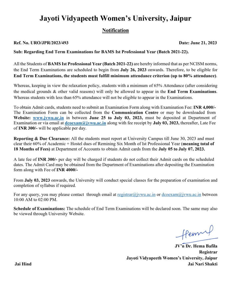 All the Students of BAMS I Professional Year (Batch 2021-22) are hereby informed that as per NCISM norms, the End Term Examinations are scheduled to begin from 25 July 2023 onwards. Therefore, to be eligible for End Term Examinations, the students must fulfill min. attendance criteria (up to 80% attendance). Whereas, keeping in view the relaxation policy, students with a minimum of 65% Attendance (after considering the medical grounds & other valid reasons) will only be allowed to appear in the End Term Examinations. Whereas students with less than 65% attendance will not be eligible to appear in the Examinations.