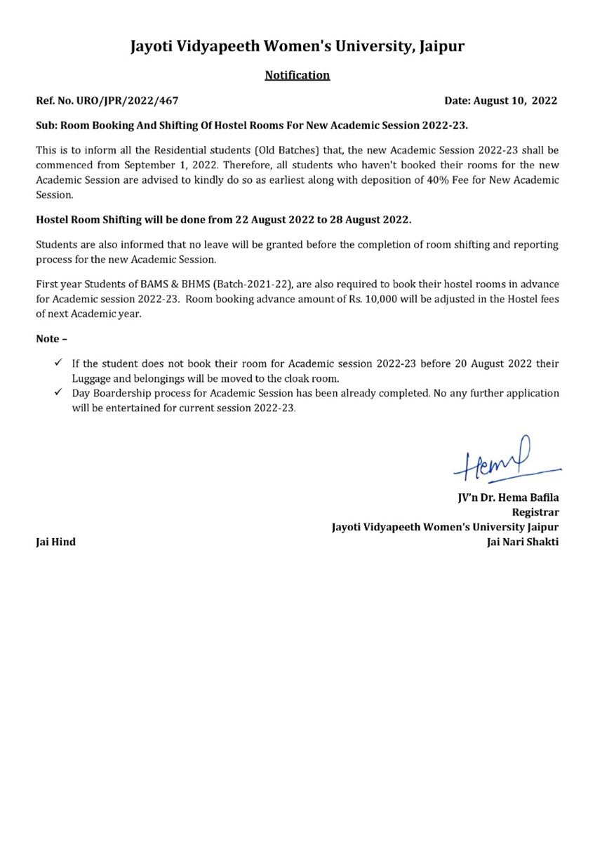 HOSTEL ROOM SHIFTING FOR NEW SESSION 2022-23