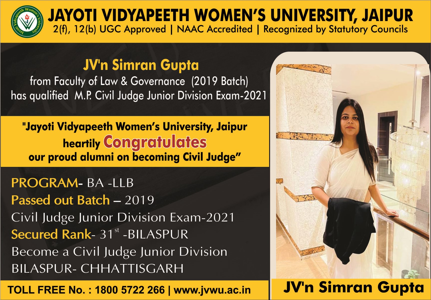 JV'n Simran Gupta, completed BA LLB Program from the Faculty of Law & Governance, Jayoti Vidyapeeth Women's University Jaipur qualified M.P Civil Judge Junior Division Examination 2021 and selected on the position of Civil Judge, Neemuch Madhya Pradesh dated 19 Feb, 2023