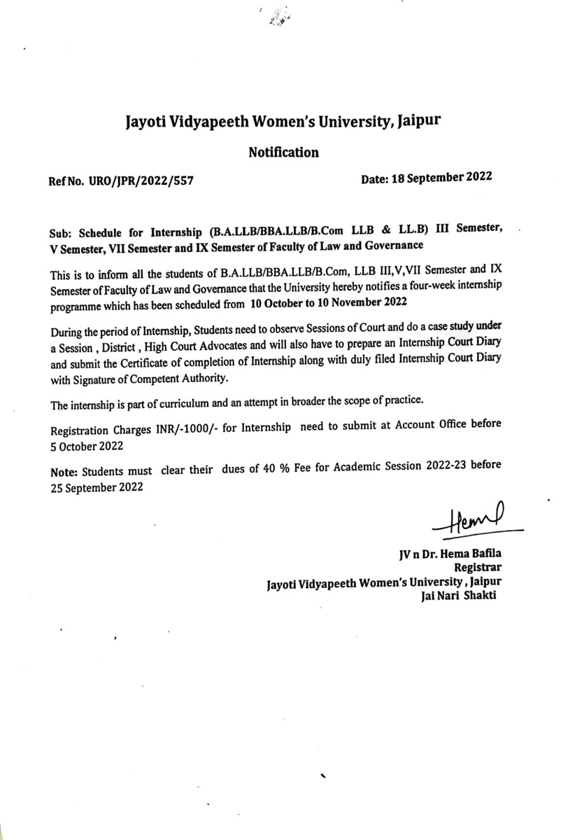 NOTIFICATION- INTENRSHIP FOR LAW STUDENTS
