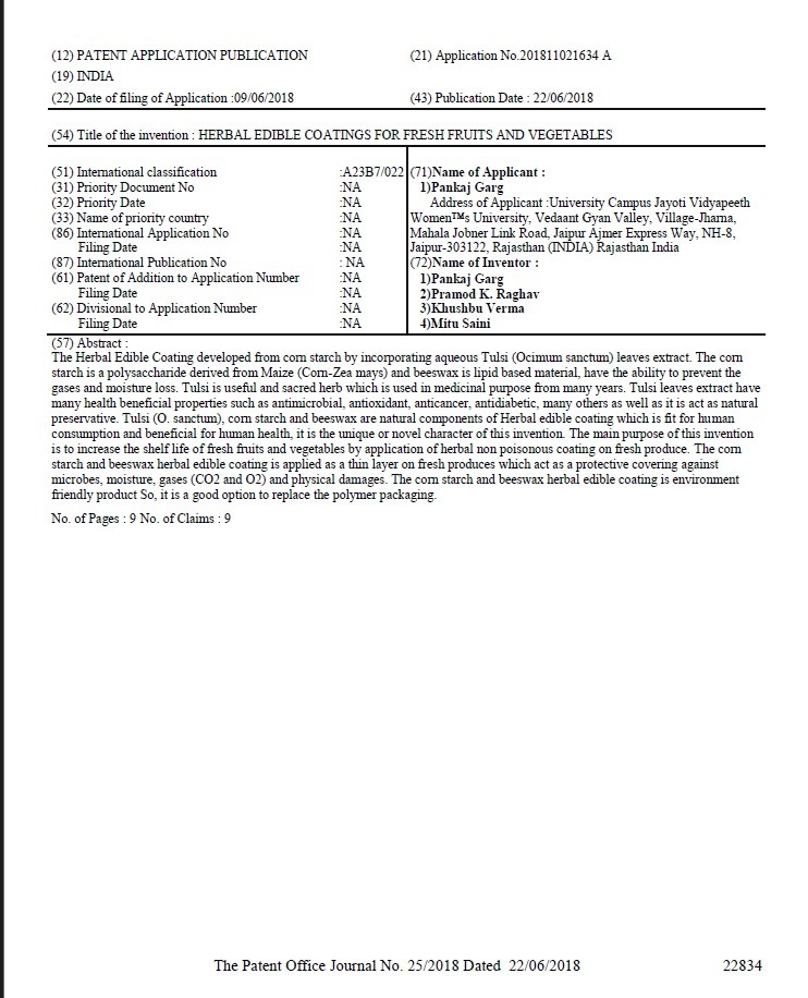 | 107 | DR DHARMENDRA AHUJA, SHEETAL SINGH | 202011046255 A | THREE ARM MAZE APPARATUS | DR. PANCKAJ GARG | 10-03-2023 | https://www.jvwu.ac.in/uploads/News/Document/0b0d300a-0ccc-4d67-9883-d8ca90dab7d1.pdf |